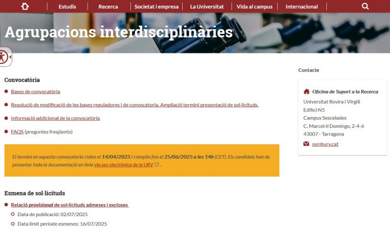 Ajuts de la Universitat Rovira i Virgili per a la creació i el foment d'agrupacions interdisciplinàries de recerca i innovació per al període 2025-2027